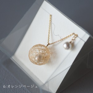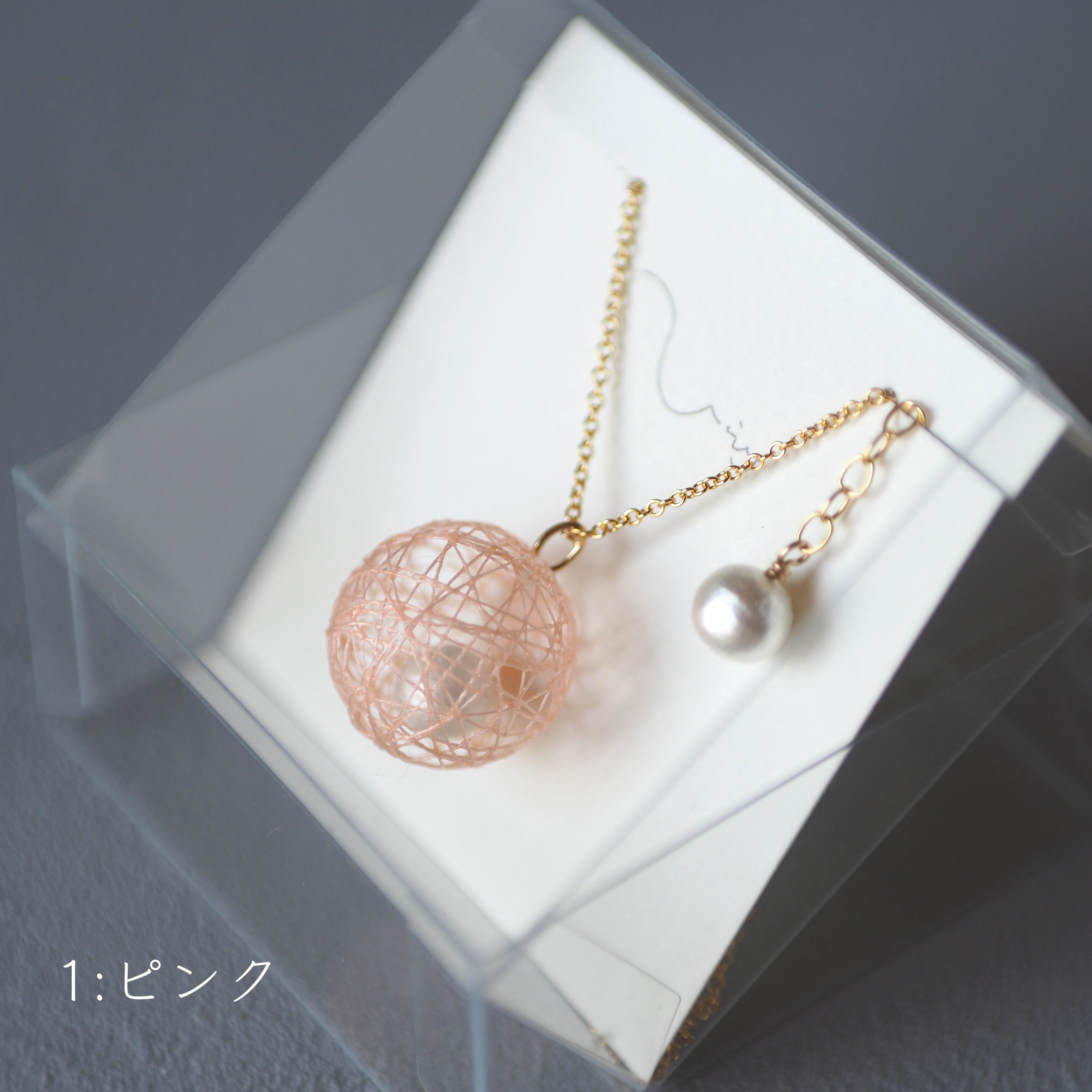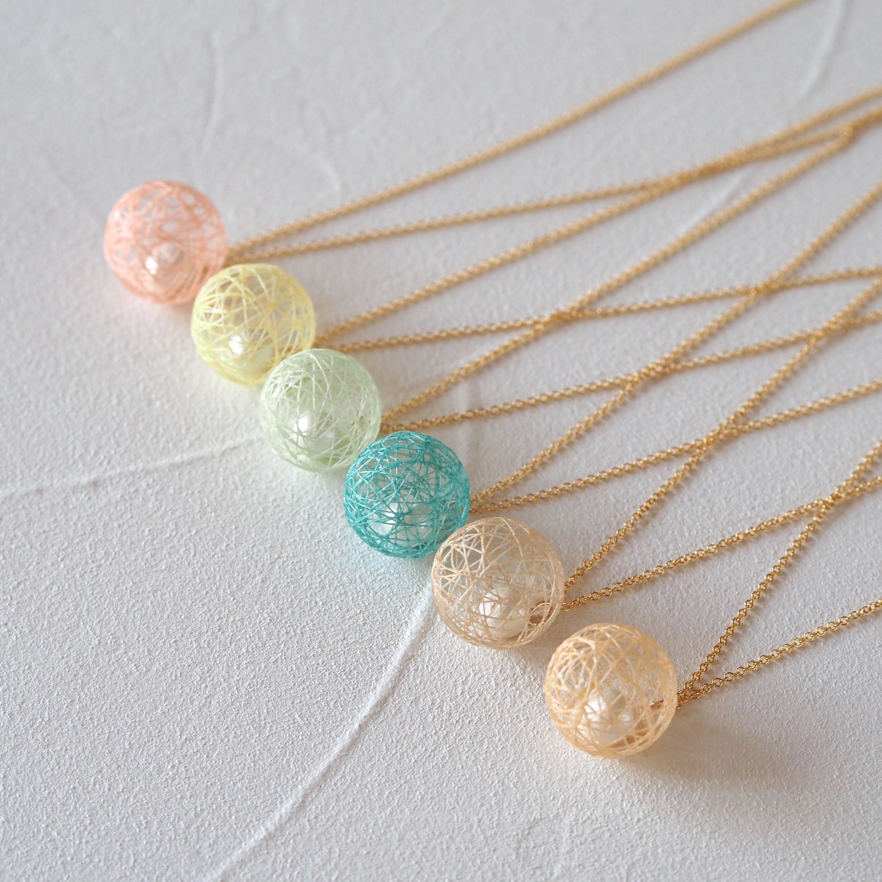 春色の絹糸でできた糸玉の中に、小さなコットンパールを包み込みました。