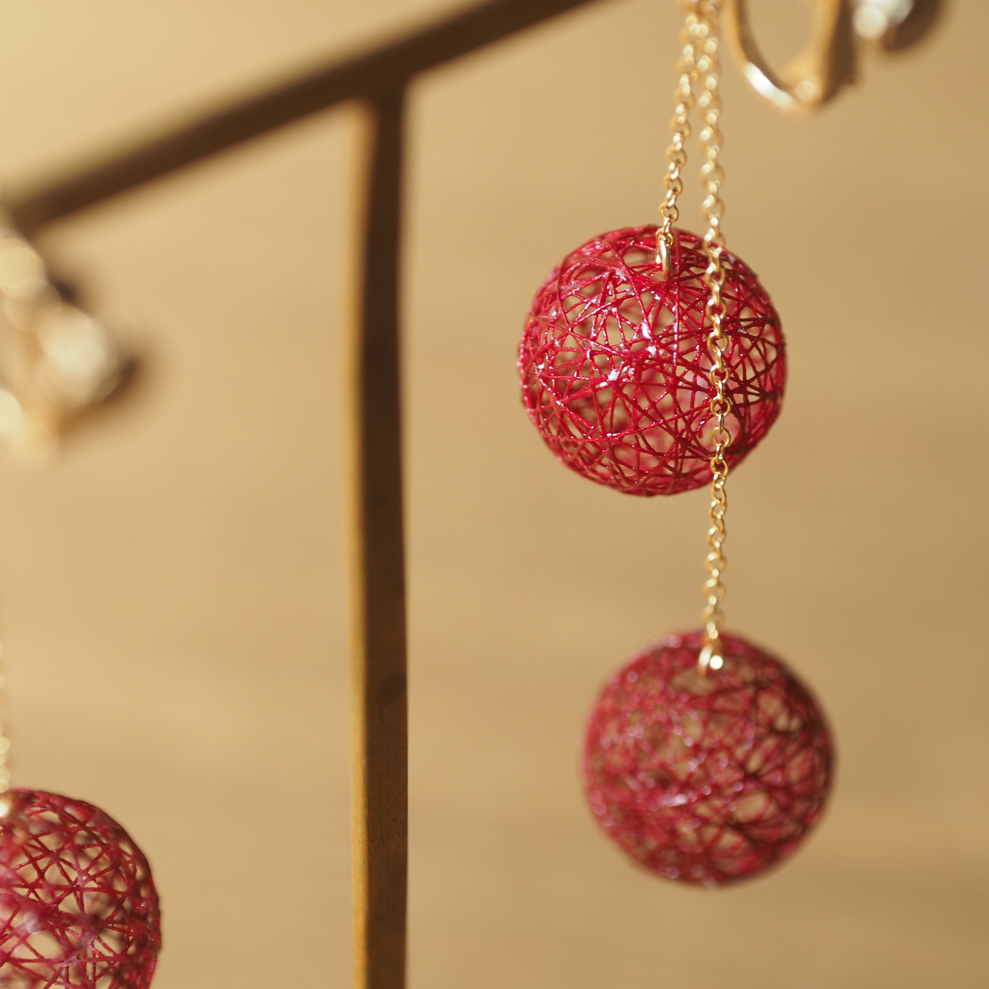 2色の赤で3つの糸玉に、アシンメトリーに仕立てました。