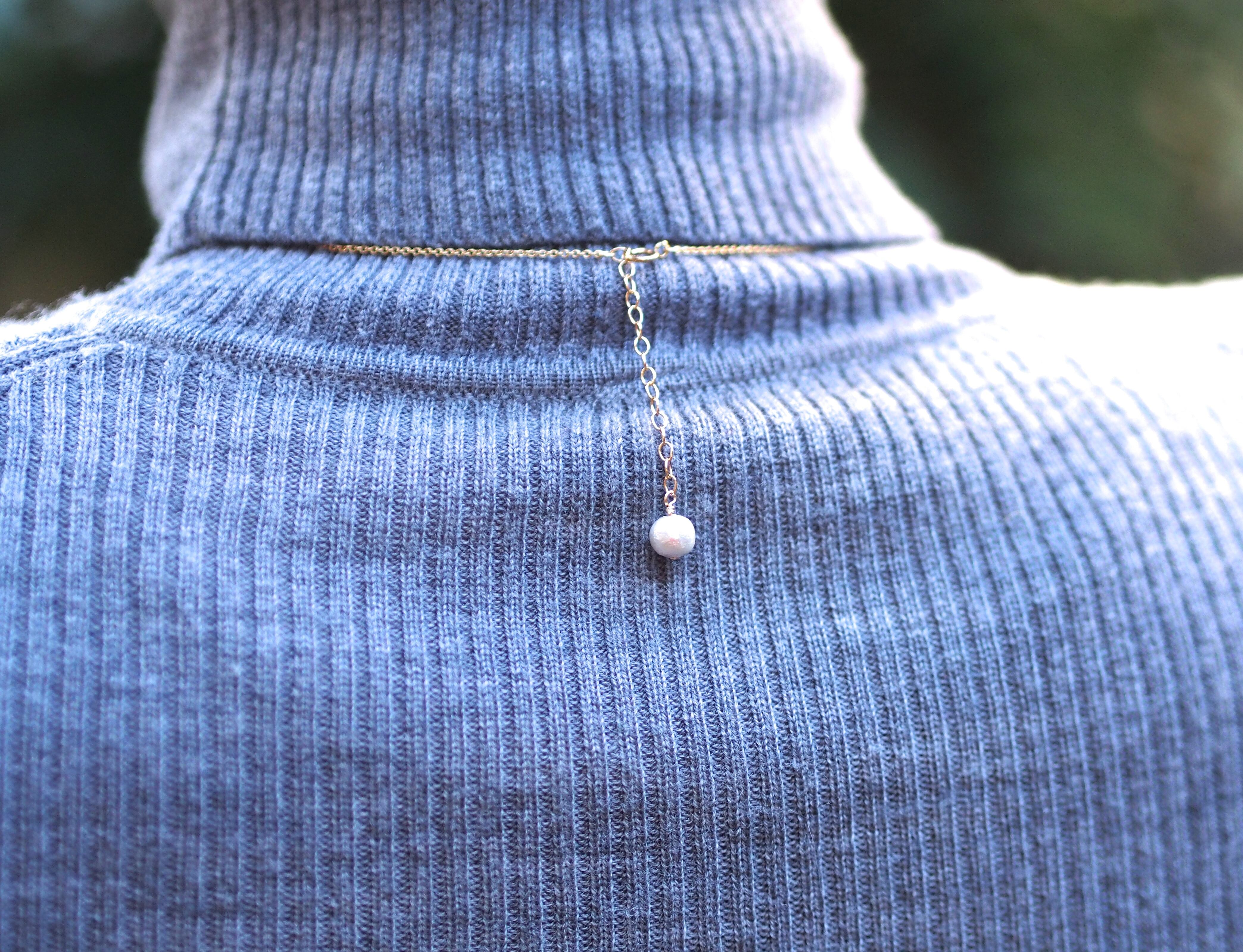 襟の開いた素肌にも、薄手のニットの上にも使えます。