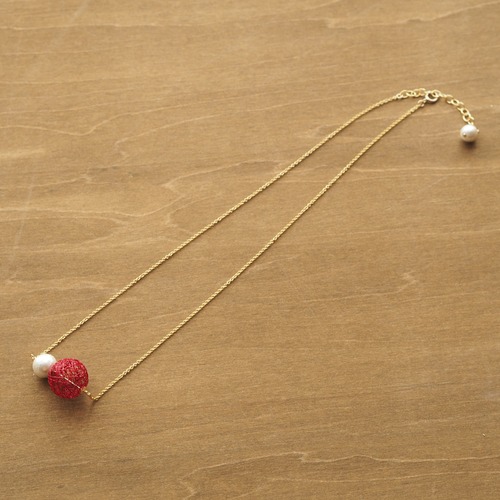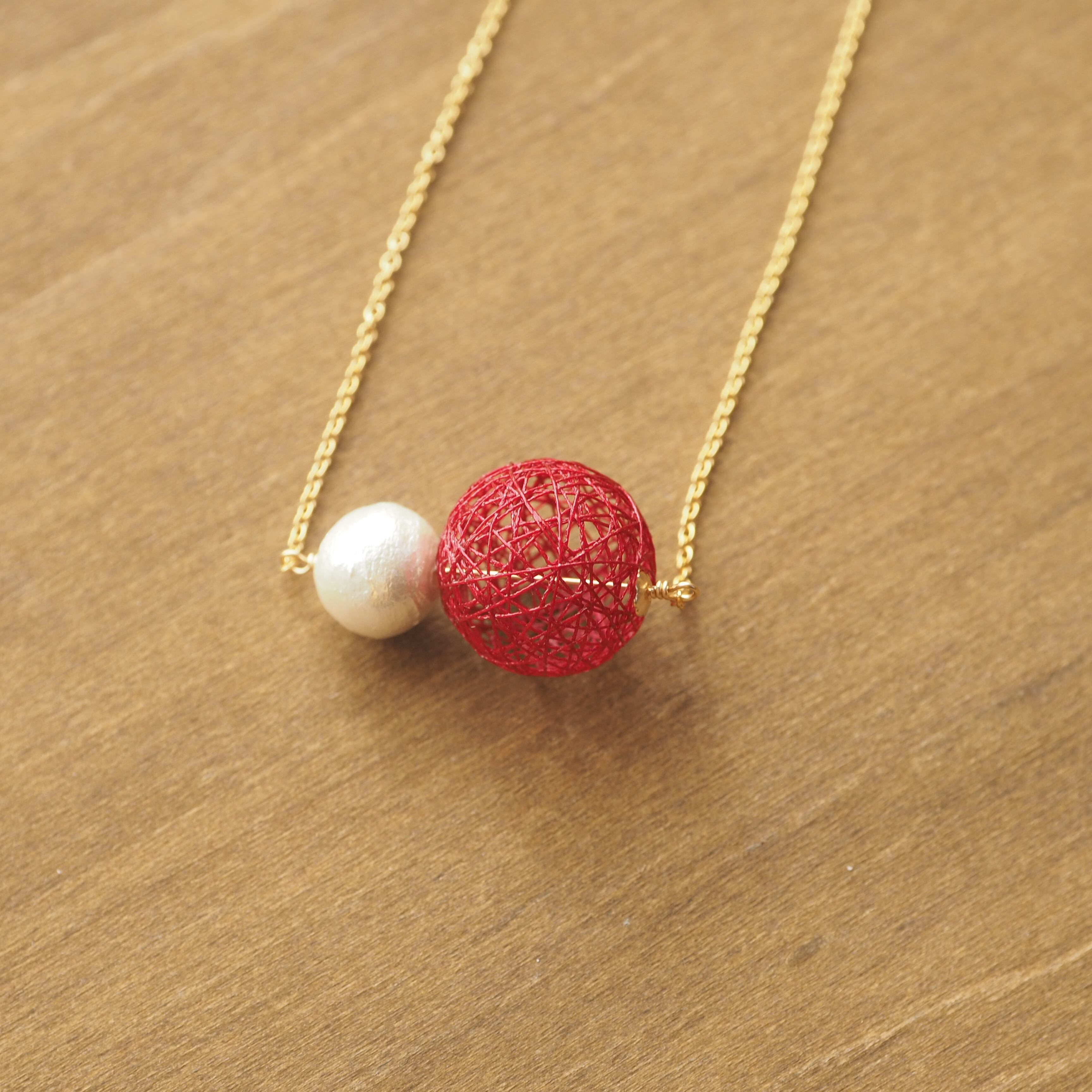 同じカラーのネックレスは、コットンパールを並べてジュエリー感をアップさせました。