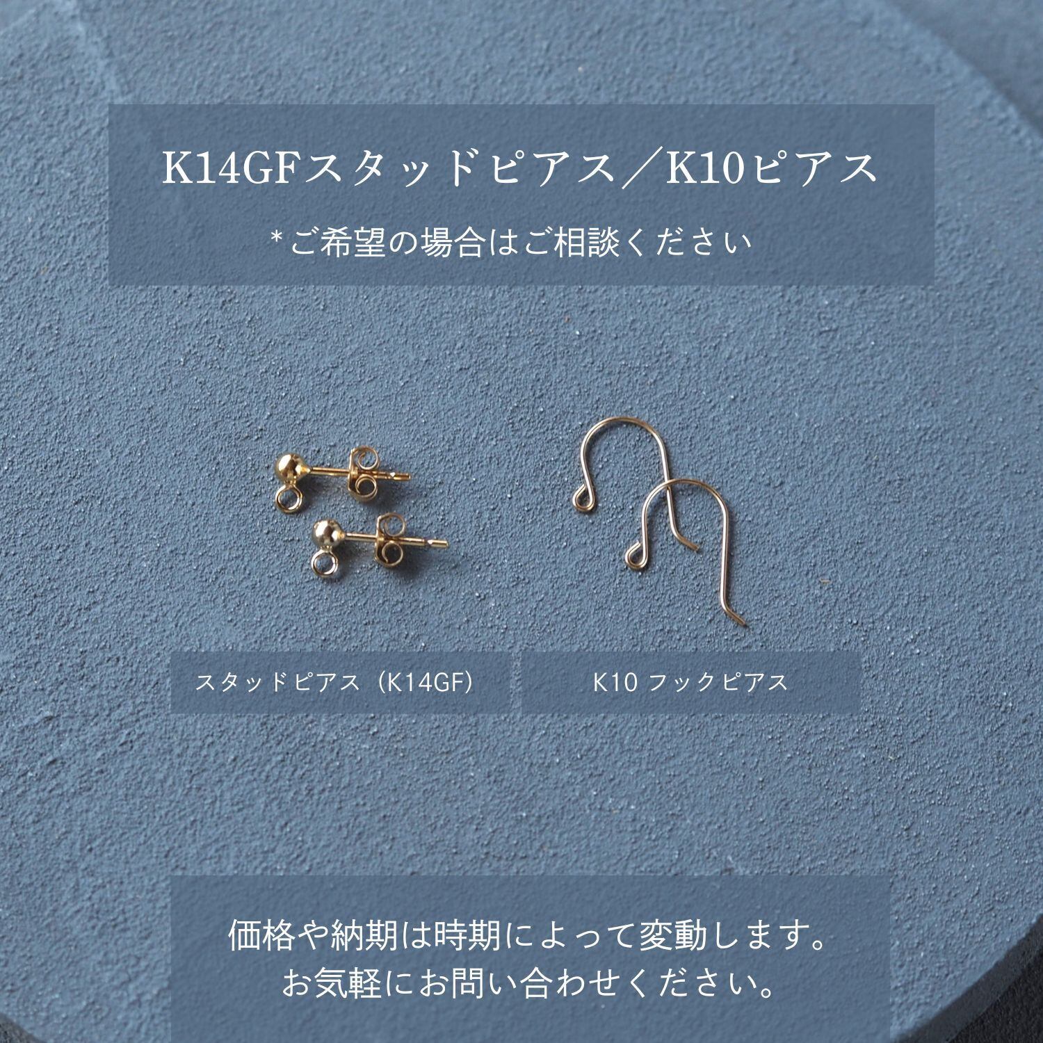 ピアスは通常で14Kgf、イヤリング・イヤーフック・指輪は真鍮ゴールドメッキ素材を使用しています。